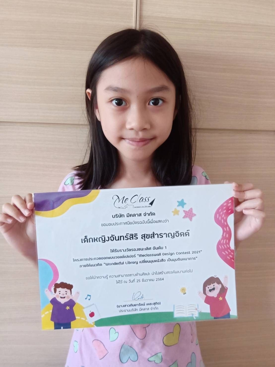 หนูรู้สึกดีใจ และภูมิใจมาก ที่ได้รับรางวัลจากมีคลาส ถึงแม้ผลงานของหนูจะยังไม่ได้เป็นรางวัลที่หนึ่งสองหรือสาม แต่ก็เป็นก้าวเล็กๆที่ให้พวกเราได้มีโอกาสพัฒนาความสามารถตนเอง