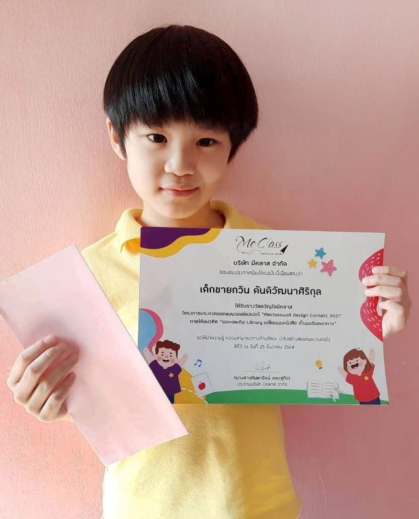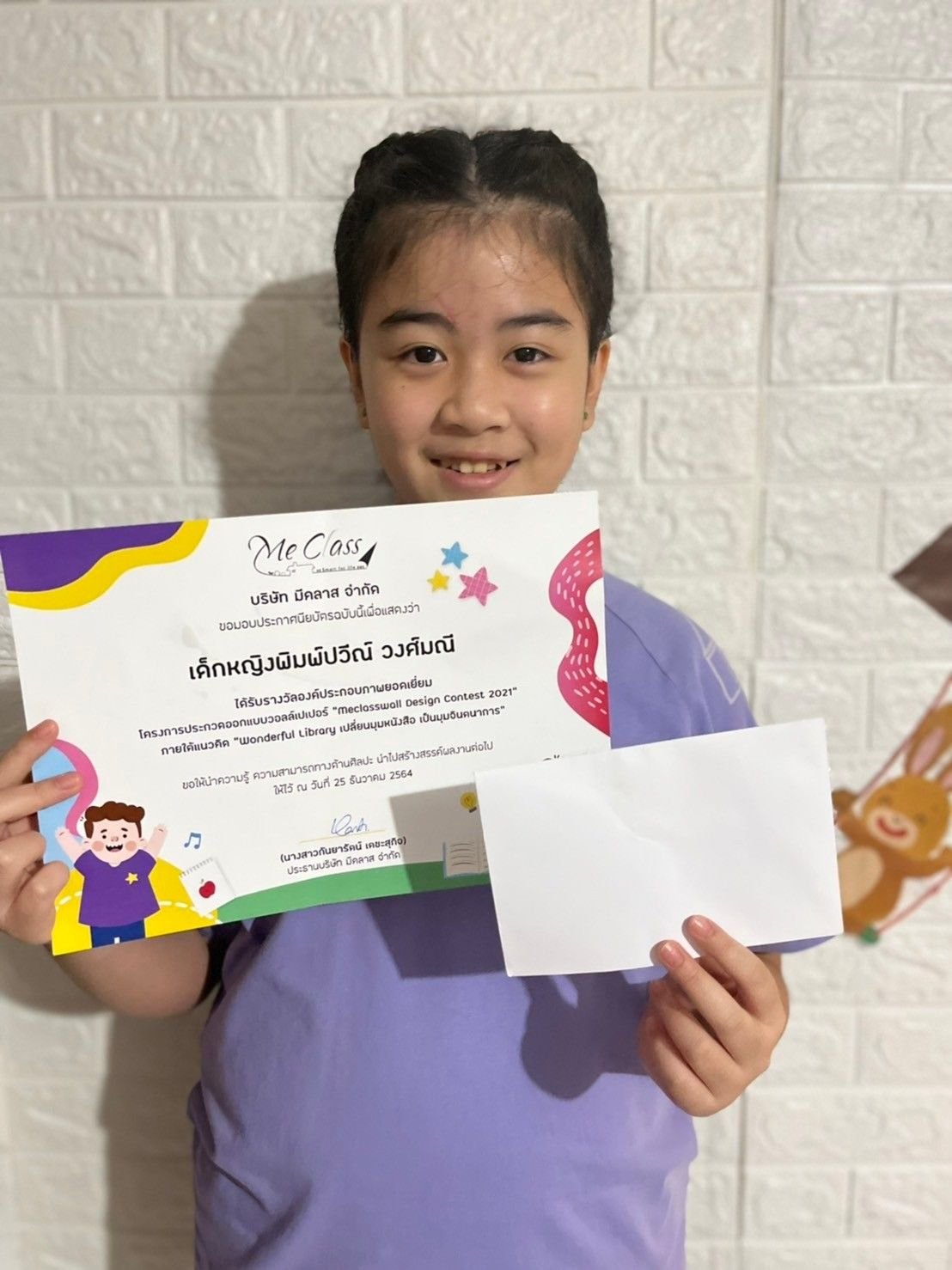 บทสัมภาษณ์ : หนูรู้สึก ตื่นเต้นและดีใจมากๆค่ะ ที่ได้ รางวัลนี้ เพราะหนูตั้งใจวาดและจินตนาการในแบบที่หนูคิด ถ่ายทอดออกมา หนูชอบวาดรูปมากค่ะ เวลาว่างก็จะวาดอยู่เสมอ ดีใจที่ Me Class จัดกิจกรรมนี้ ให้เด็กค่ะ ขอบคุณมากค่ะ