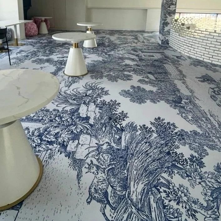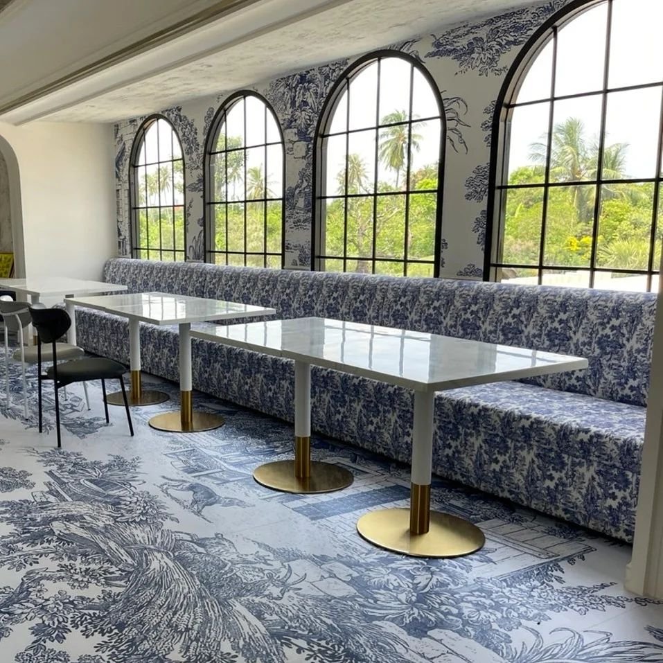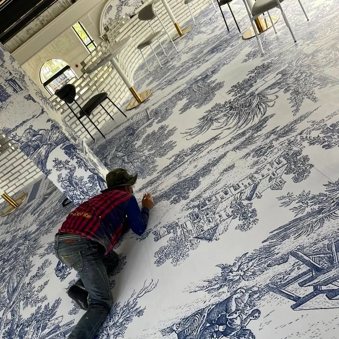 ภารกิจที่ 1 แปลงโฉมพื้นร้านอาหาร/คาเฟ่แบบเดิมๆให้สุดเท่ ด้วย Sticker Digital Print Base มาตื่นเต้นไปกับผลงานติดตั้งจริง "สติ๊กเกอร์ปูพื้น" ร้านอาหารกึ่งคาเฟ่สวยๆ โทนสีฟ้า ลายเส้นคมชัดมาก แถมยังสามารถออกแบบลายได้ด้วยตัวเองอีกด้วย