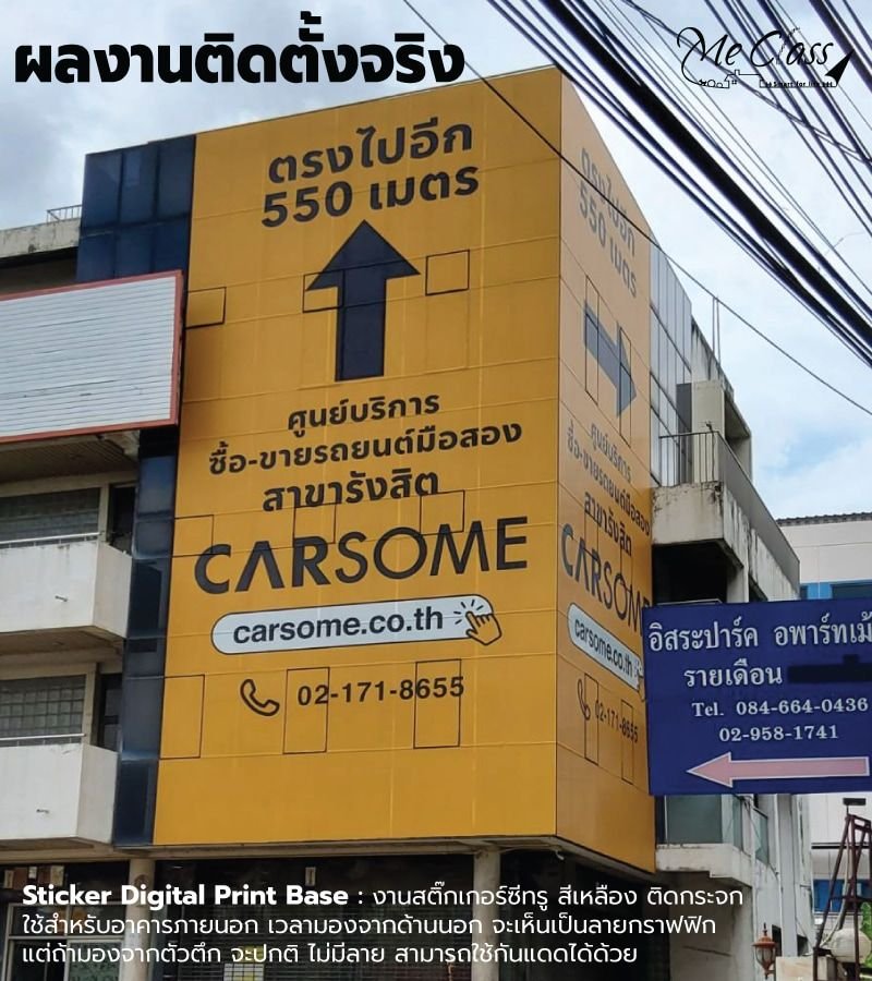 ภารกิจที่ 2 พบกับผลงานติดตั้งจริง Sticker Digital Print Base งานสติ๊กเกอร์ซีทรู สีเหลือง ติดกระจก ใช้สำหรับอาคารภายนอก เวลามองจากด้านนอก จะเห็นเป็นลายกราฟฟิก แต่ถ้ามองจากตัวตึกจะปกติ ไม่มีลาย ใช้กันแดดได้ด้วย