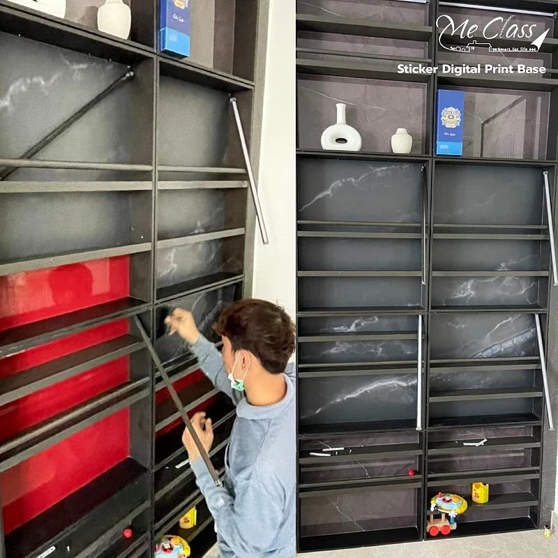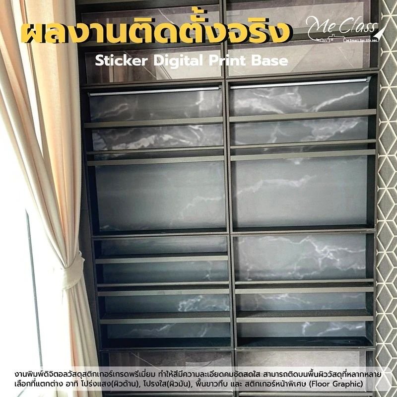 ภารกิจที่ 4 พบกับผลงานติดตั้งจริง Sticker Digital Print Base เกรดพรีเมี่ยม ลาย Marble ใช้สำหรับตกแต่งกระจกใส เหมาะสำหรับตกแต่งภายใน เราใช้หมึกพิมพ์นำเข้าจากยุโรป งานออกมาสีสดใส ทำให้ลายหินอ่อนคมชัด เหมือนจริงมากค่ะ