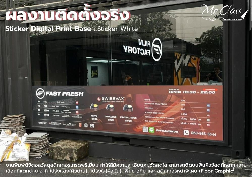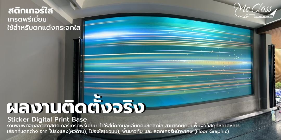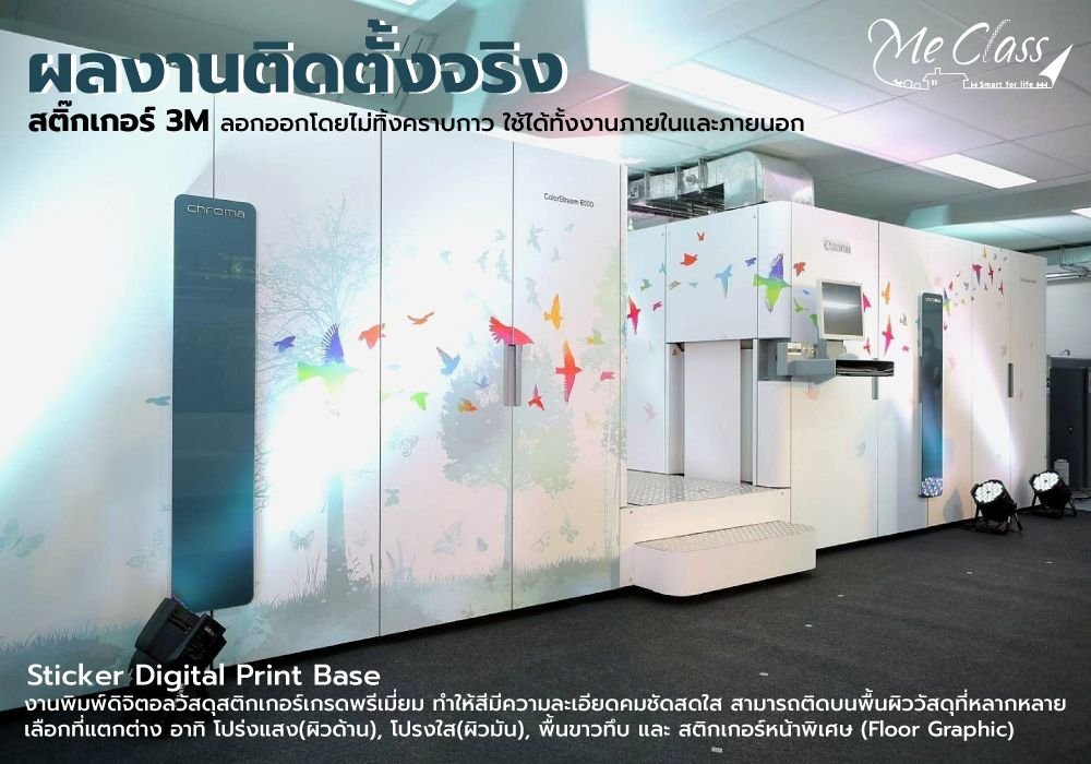 งานพิมพ์ดิจิตอลวัสดุสติกเกอร์เกรดพรีเมียม จึงทำให้สีมีความละเอียดคมชัดสดใส สามารถติดบนพื้นผิววัสดุที่หลากหลาย มาพร้อมกับตัวเลือกที่แตกต่าง อาทิ โปร่งแสง(ผิวด้าน), โปรงใส(ผิวมัน), พื้นขาวทึบ และ สติกเกอร์หน้าพิเศษ (Floor Graphic)