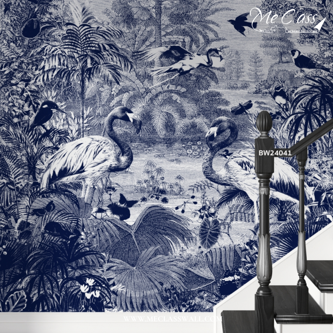 วอลเปเปอร์สั่งพิมพ์ตามขนาดพื้นที่ งานลายเส้นสีขาวฟ้า ตกแต่งผนังบริเวณบันได ลายสวยจึ้ง โทนสีฟ้าเข้ม โดดเด่น มีมิติ ใครเห็นเป็นต้องชอบอย่างแน่นอน