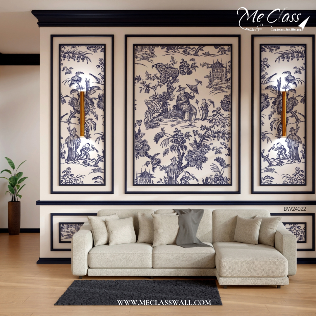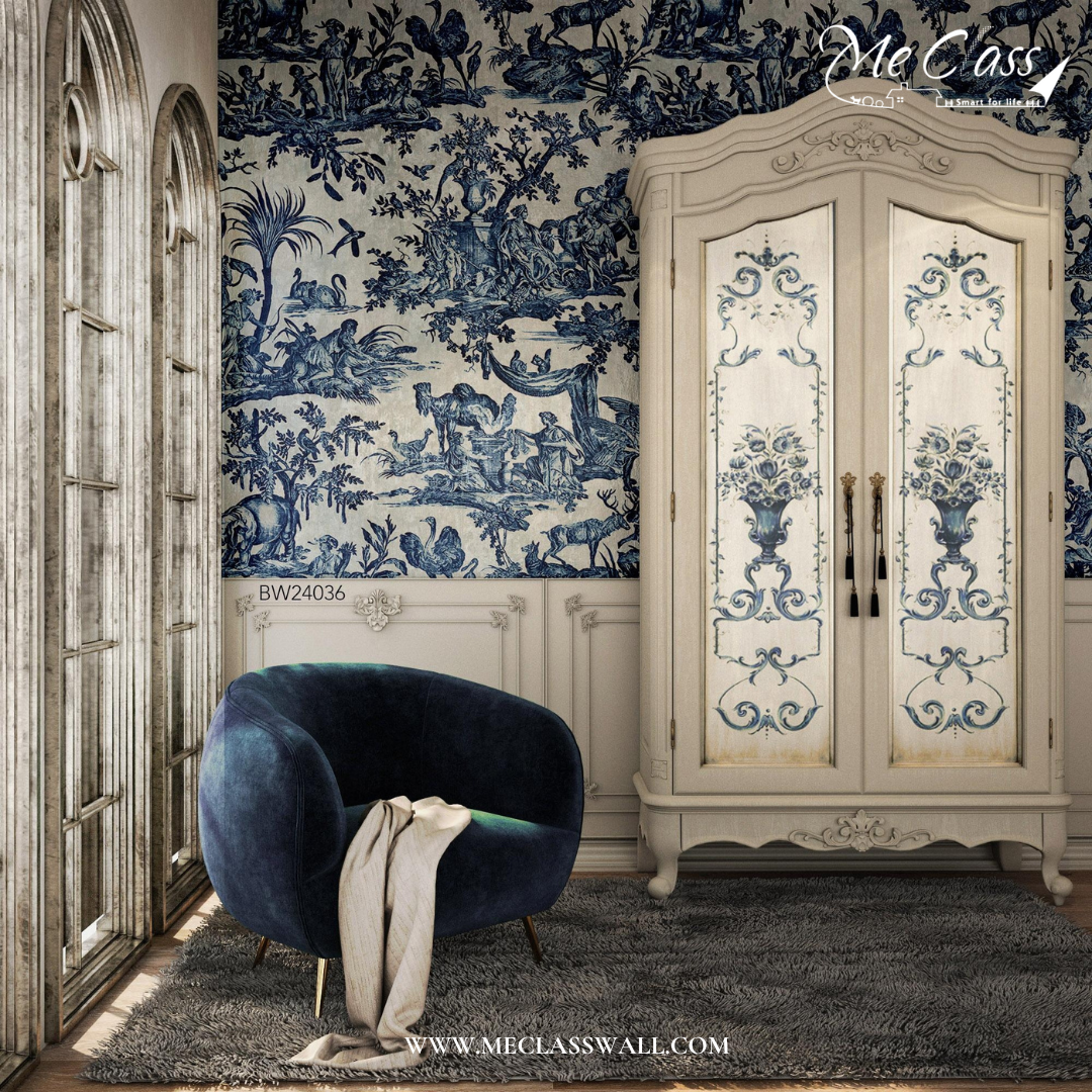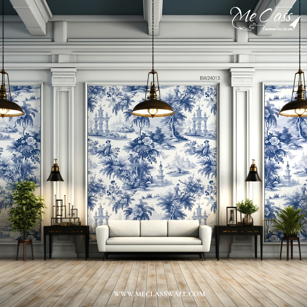 วอลเปเปอร์สั่งพิมพ์ลายเส้นสีฟ้าขาว (Blue White Wallpaper) งานวินเทจ 90s สไตล์จีน-ยุโรป สายอินทีเรียน่าจะชื่นชอบ ลายนี้มีการผสมผสานกับงานคิ้วบัว (Classic Interior) ทำให้ผนังดูมีมิติ เพิ่มความโดดเด่น สวยงามให้กับห้องมากยิ่งขึ้น