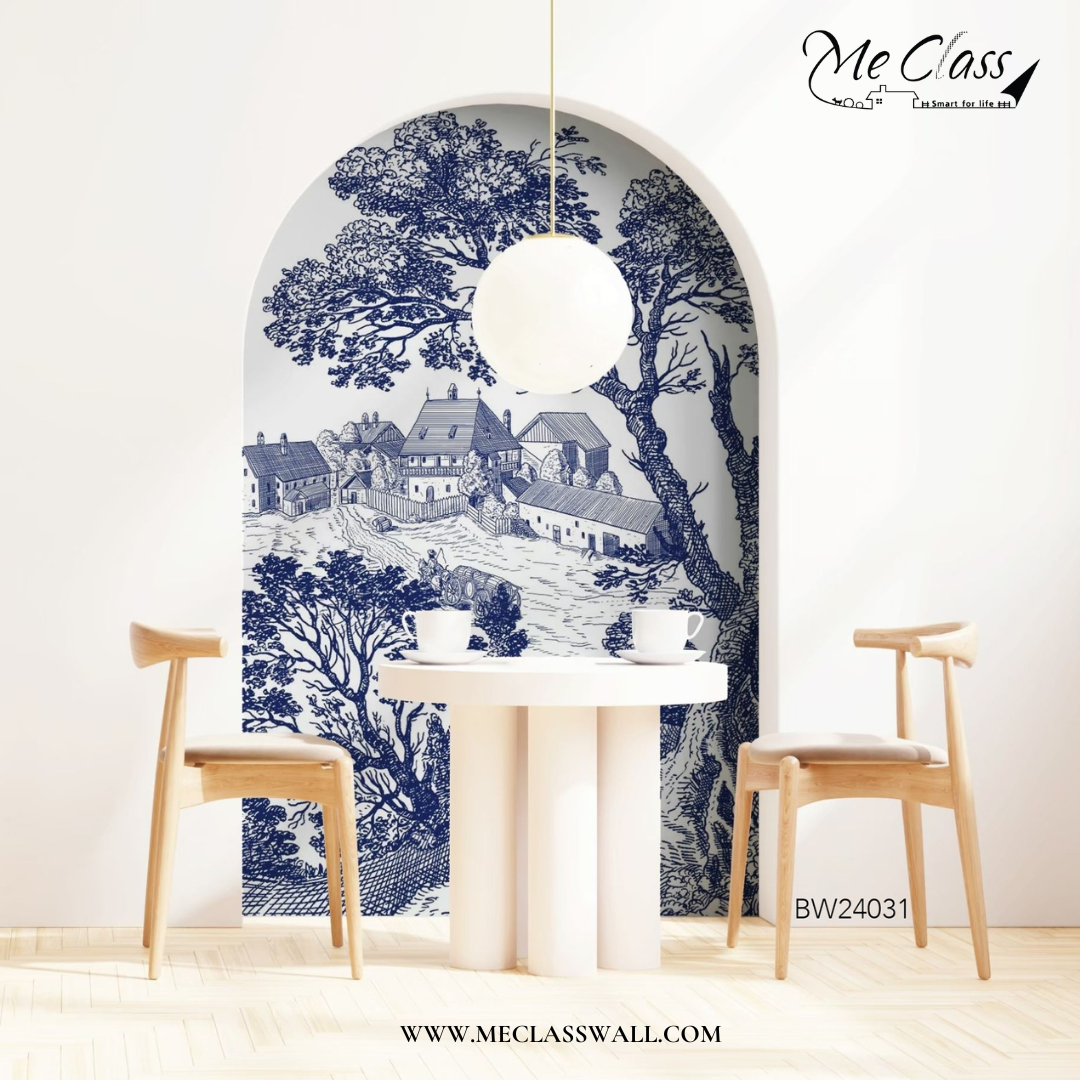 ยกให้เป็นอีก 1 ลายยอดนิยมมากที่สุดในคอลเลคชั่นเลยก็ว่าได้ ไปกับวอลเปเปอร์สั่งพิมพ์ลายเส้นสีฟ้าขาว (Blue White Wallpaper) ลายภาพวาดบ้านในชนบท มาพร้อมกับผนังทรงโค้ง สวยเก๋ ไม่เหมือนใคร