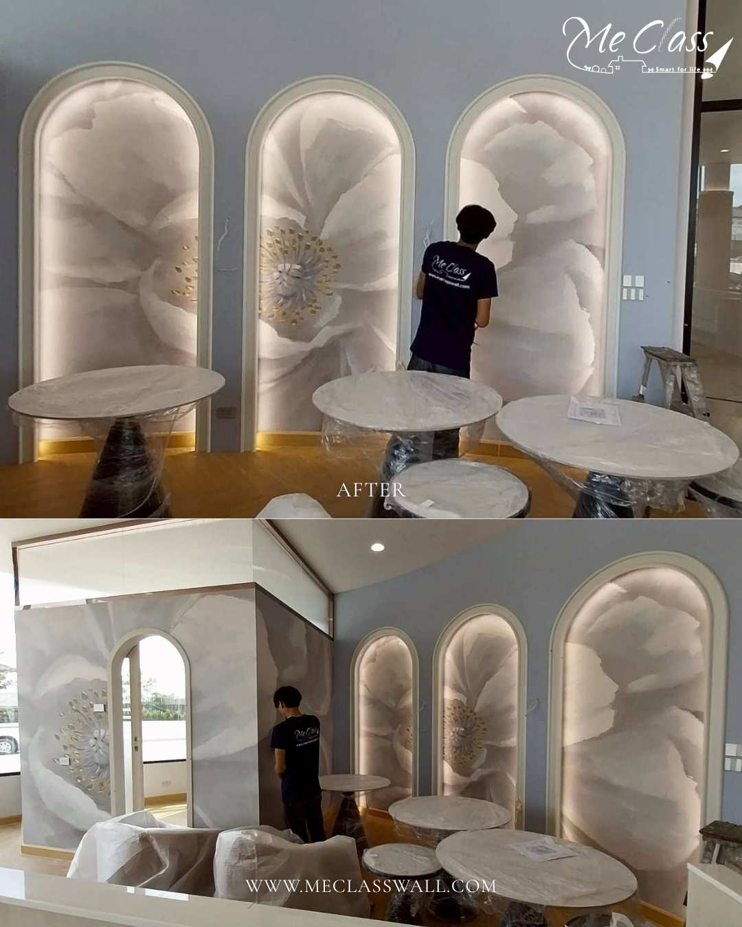 After: การใช้ลายหินอ่อน (Marble Pattern) ช่วยให้ผนังดูมีราคาเหมือนใช้หินจริง แต่ประหยัดงบไปได้เยอะ แถมยังทำความสะอาดง่ายกว่าผนังทาสีทั่วไปอีกด้วย เหมาะสำหรับตกแต่งภายในห้องรับแขก ห้องรับประทานอาหาร หรือห้องทำงานที่เน้นความ Modern