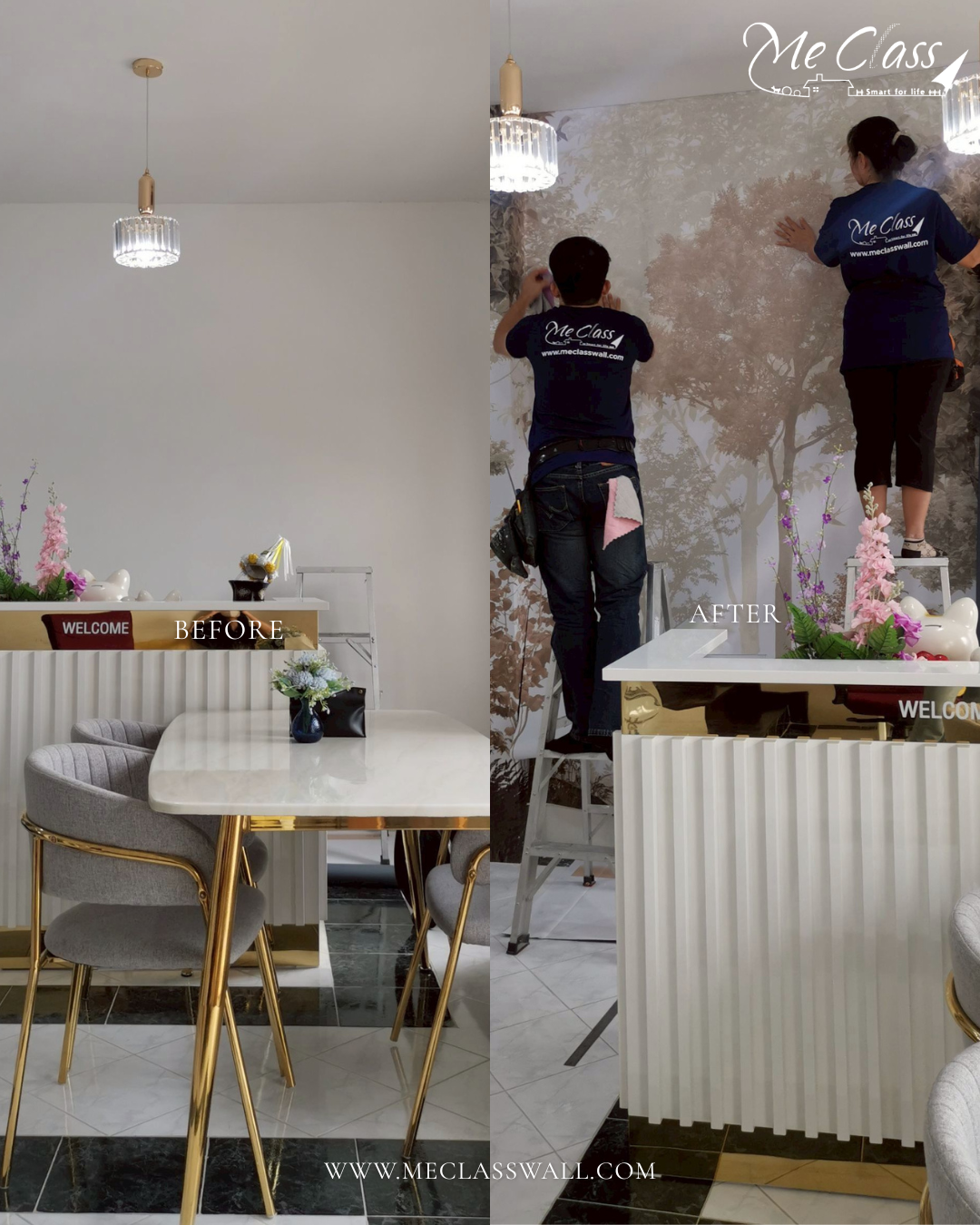 After: วอลเปเปอร์ติดผนังทำหน้าที่เป็น "ฉากหลัง" ที่ช่วยดึงทุกอย่างให้เข้าพวกกัน เช่น การใช้วอลเปเปอร์ลายไม้เพื่อความมินิมอล, วอลเปเปอร์ลายธรรมชาติ ใบไม้ ป่า ช่วยเพิ่มความสดชื่น หรือวอลเปเปอร์ 3D ลายจีโอเมตริกเพื่อความทันสมัย