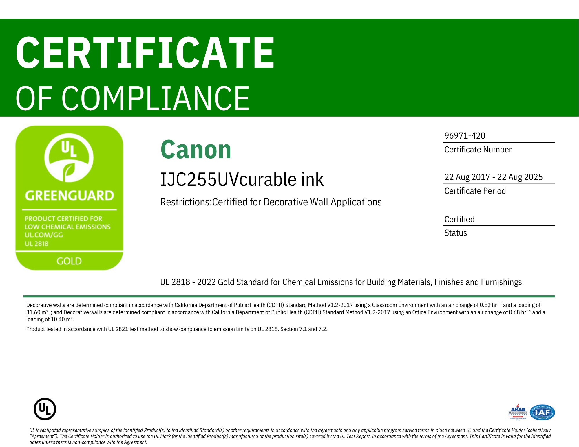 - ฟอร์มูลาพิเศษที่ยืดหยุ่นกว่าหมึก UV ทั่วไป — รองรับการติดตั้งวอลเปเปอร์บนผนังโค้งหรือมุมได้ดีขึ้น
