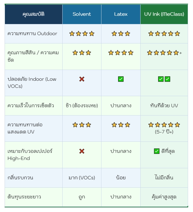 จากตารางจะเห็นว่า UV Ink (โดยเฉพาะในระดับที่ Me Class ใช้) ชนะในเกือบทุกมิติที่สำคัญสำหรับงานวอลเปเปอร์ระดับพรีเมียม